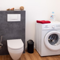 Im Erdgeschoss neben dem Eingang befindet sich ein Gäste WC, in dem sich auch die Waschmaschine befindet., die kostenlos zur Verfügung steht.