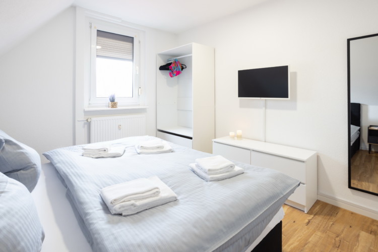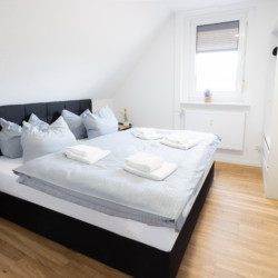 Das Schlafzimmer im 1. OG ist mit einem großen Doppelbett (180 x 200), Kommode und Kleiderschrank ausgestattet.