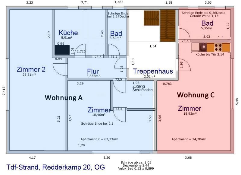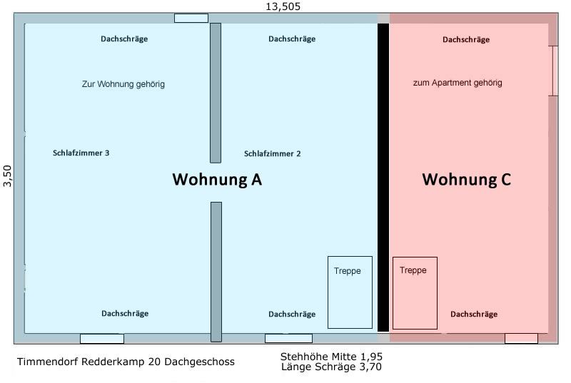 Insgesamt bietet unser Haus Schlafmöglichkeiten für bis zu 16 Personen. Wohnung A bietet 3 Schlafzimmer auf zwei Etagen. Im unteren Bereich finden Sie in Schlafzimmer 1 Doppelbett (180 x 200 cm) und ein Einzelbett (100 x 200). Im ausgebauten Dachboden befinden sich im Schlafzimmer 2 weitere zwei Einzelbetten (90 x 200). Dieses ist das Durchgangszimmer zu Schlafzimmer 3 mit einem komfortablen Doppelbett (180 x 200).