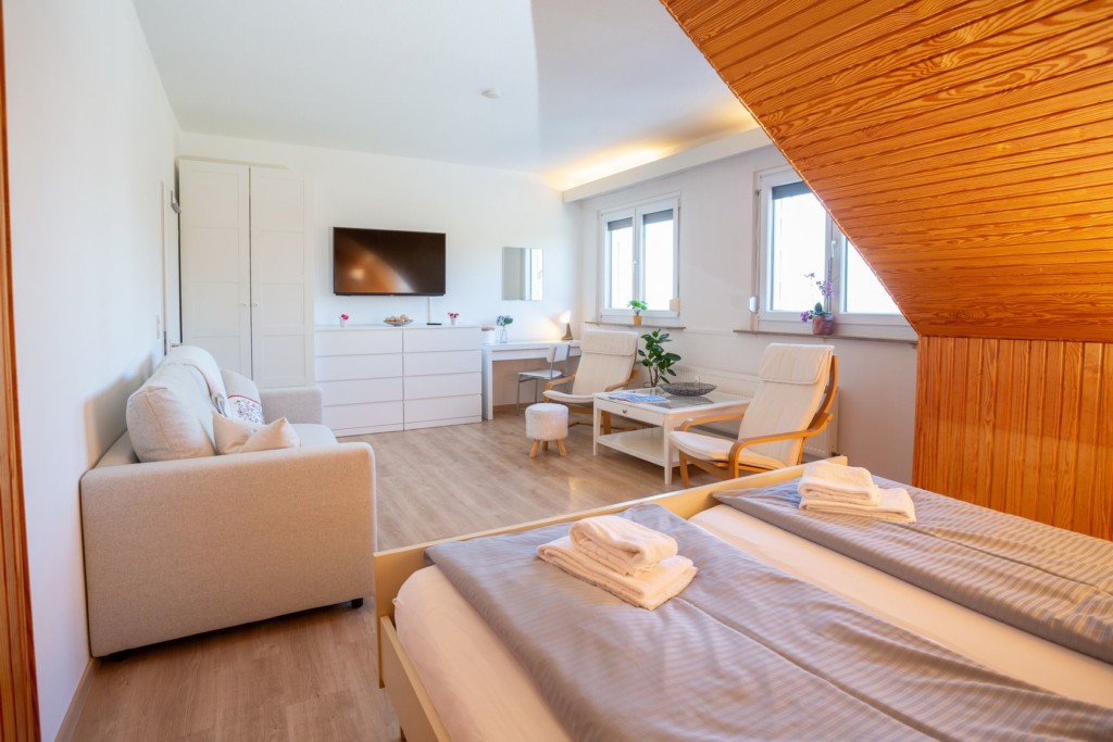 Die Küche ist mit modernen Geräten ausgestattet, darunter ein Herd, ein Backofen, eine Mikrowelle und ein Kühlschrank mit Gefrierfach. Diese Geräte ermöglichen es Dir, eine breite Palette von Gerichten zuzubereiten, sei es ein einfaches Frühstück, ein hausgemachtes Abendessen oder ein Snack zwischendurch. Eine Spüle und Arbeitsflächen bieten ausreichend Platz zum Zubereiten und Abwaschen von Geschirr. Genieße Deine Mahlzeiten drinnen am Esstisch oder draußen auf dem Balkon, wo Du die frische Luft und die Natur genießen kannst.